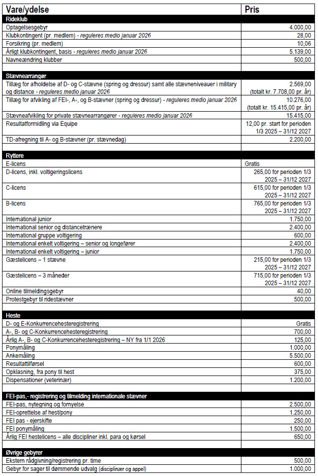 Her finder du Dansk Ride Forbunds samlede prisliste for 2026.